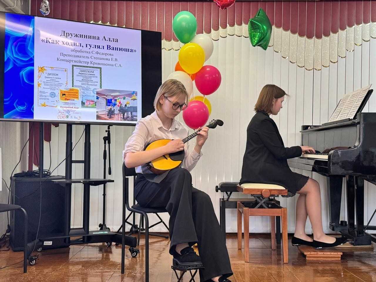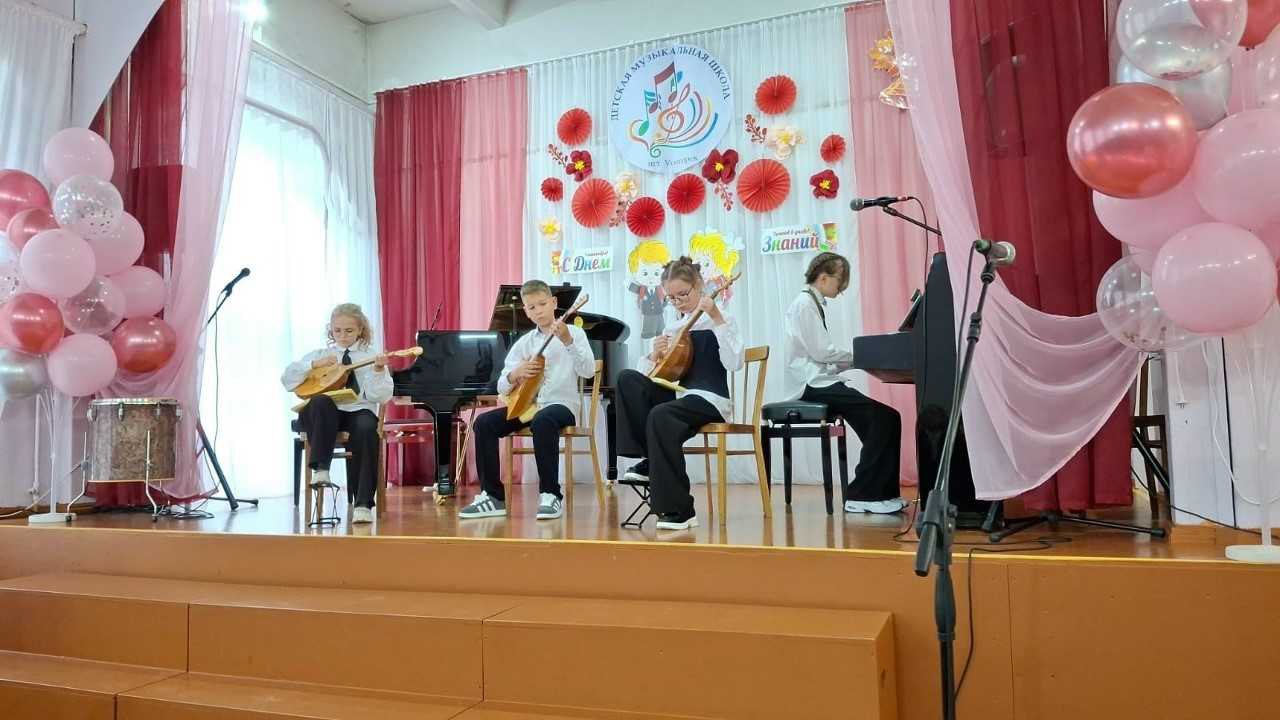 баяны «Юпитер», аккордеон, балалайки, домру и рояль «Николай Рубинштейн», ноутбук, проектор, акустическую колонку и интерактивную доску.