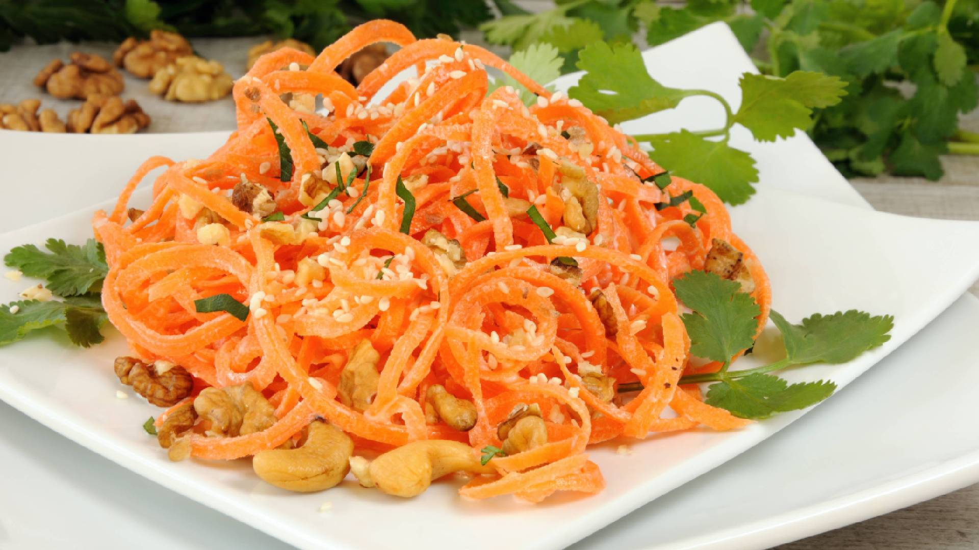 Это овощное блюдо станет прекрасным дополнением к обеду или ужину. Салат украсит любой стол и подарит ощущение сытости после нескольких ложек. А сочетание тертой моркови и грецких орехов понравится даже самым привередливым членам семьи.