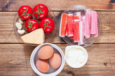 Добавление помидоров и сыра: Помидоры нарезать небольшими кусочками и добавить к крабовым палочкам и яйцам. Твёрдый сыр натереть и также вмешать в салат.
