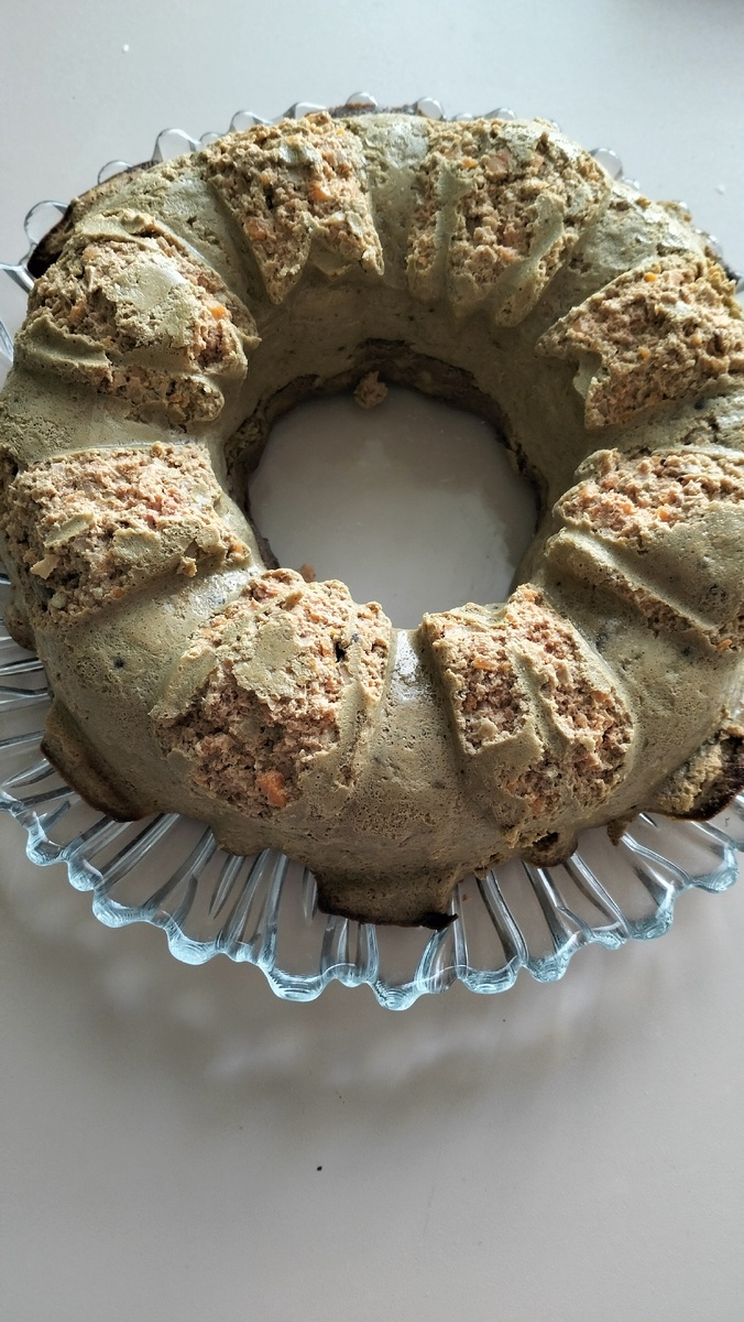 Печень (примерно 500 граммов) отправилась в блендер вместе с одной луковицей и морковкой. Я всё тщательно перемешала, добавила специи и, хоть мускатный орех закончился, не растерялась. В массу были добавлены два сырых яйца и полбаночки оливок, нарезанных пополам. Всё это я вылила в подходящую форму и поставила готовиться в разогретую до 170 градусов духовку, оставив на 50 минут, пока уезжала на работу.