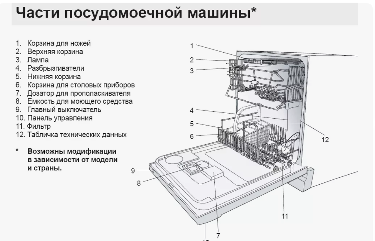 Посудомоечная машина — это высокотехнологичный прибор, который эффективно выполняет свою задачу благодаря целой системе элементов, работающих в идеально слаженном режиме. Давайте подробнее рассмотрим её конструкцию и принцип работы.