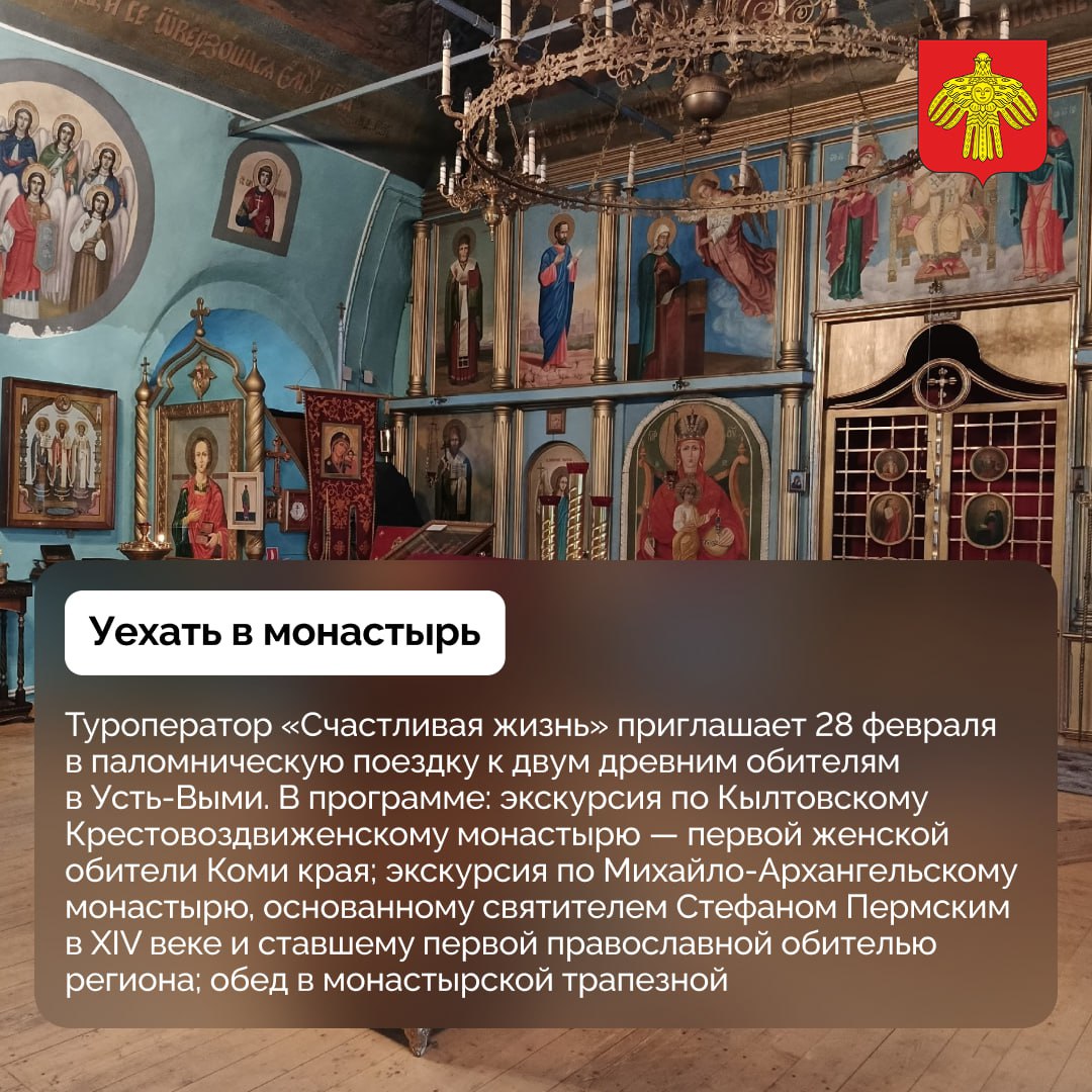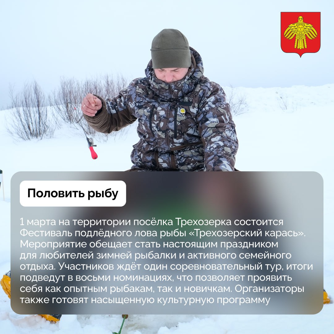 В подборке — паломническая поездка к двум древним обителям, Фестиваль подлёдного лова рыбы «Трехозерский карась», спокойный семейный отдых и другое.