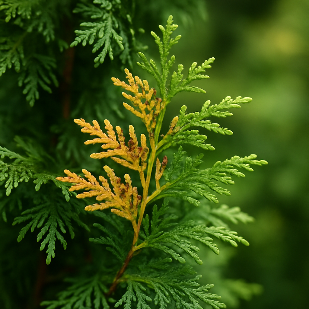 - Вредители: Наличие паутины или мелкой пыли на хвое может указывать на паутинного клеща, который ослабляет растения.