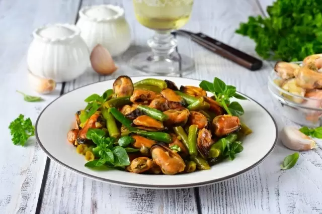 На сковороде разогрейте растительное масло на сильном огне и добавьте мидии. Обжаривайте их около 2-3 минут, параллельно добавив стручковую фасоль и чеснок.