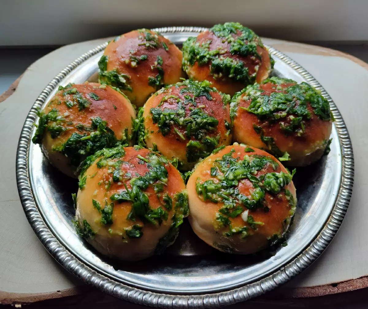 Перед выпечкой булочки смазывают молоком или яичным желтком, если кто-то предпочитает более насыщенный вкус. Время выпекания составляет примерно 18 минут. Когда пампушки станут золотистыми, их достают из духовки.
