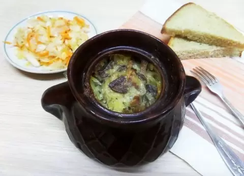 Смешайте мясо с грибами и добавьте в картофельную смесь, приправив все зеленью, солью и перцем. Выложите получившуюся массу в смазанные сливочным маслом горшочки, закройте крышками и отправьте в разогретую до 200°C духовку на 50 минут.