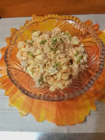 Ананас из банки нарезается кубиками и обязательно даётся стечь лишнему соку — иначе салат будет излишне жидким. Консервированные шампиньоны режут тонкими ломтиками. Все компоненты складывают в салатник, приправляют солью и молотым чёрным перцем, заправляют столовой ложкой майонеза и аккуратно перемешивают.