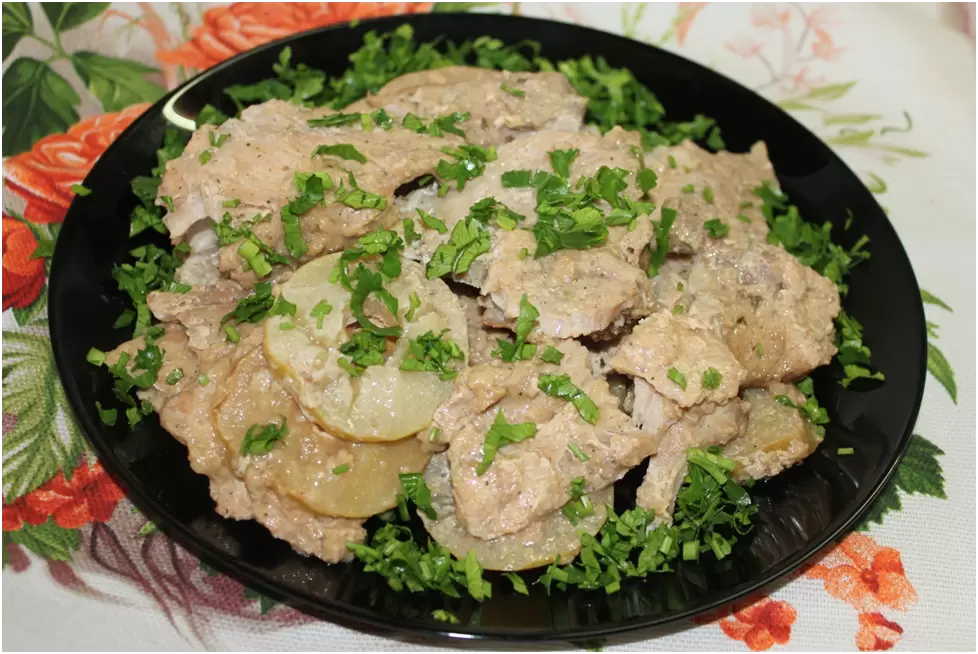 Яблоки очищают от сердцевины и нарезают кольцами или дольками. Эти фрукты придадут блюду уникальный кисло-сладкий привкус и послужат своеобразной прослойкой между мясом.