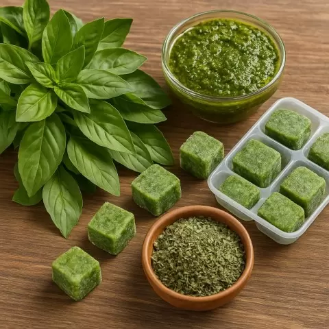 Создание базиликовой пасты — это отличный способ не только сохранить зелень, но и создать ароматный соус. Для этого свежие листья базилика перемалываются в блендере с добавлением соли и оливкового масла, превращаясь в густую пасту. Ее можно расфасовать по контейнерам для заморозки или хранить в баночках.