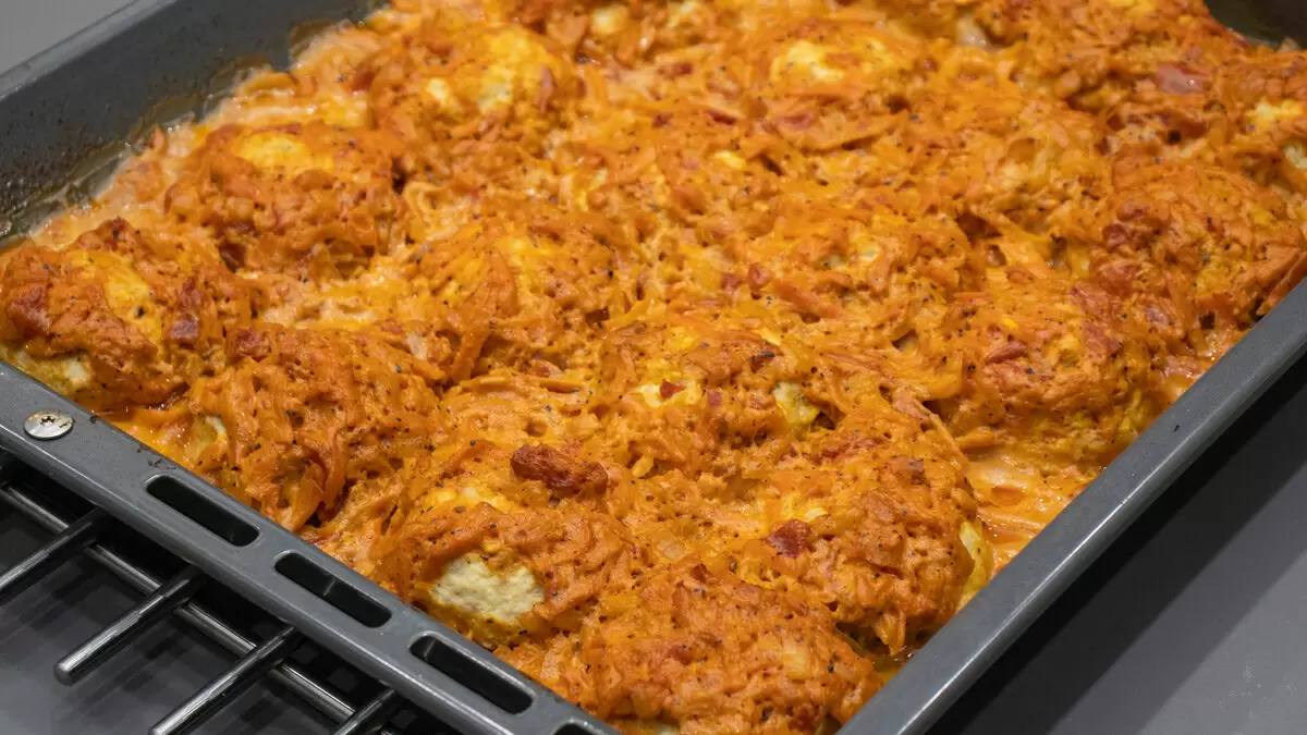 В отдельной миске смешиваются сметана и мука. Эта смесь добавляется в соус, после чего заливается горячей водой. Все ингредиенты аккуратно перемешиваются, а далее соус выливается на тефтели. Противень накрывается фольгой и отправляется в разогретую до 200°С духовку примерно на 40 минут. Затем, убрав фольгу, блюдо запекается ещё 20-30 минут для золотистой корочки.