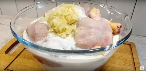 Все ингредиенты перемешиваются до однородной массы, после чего курицу помещают в маринад. Рекомендуется оставить ее в холодильнике на минимум пять часов, а лучше на всю ночь. Это обеспечит качественное проникновение маринада в мясо.