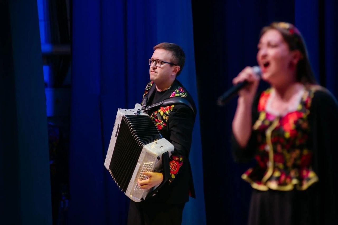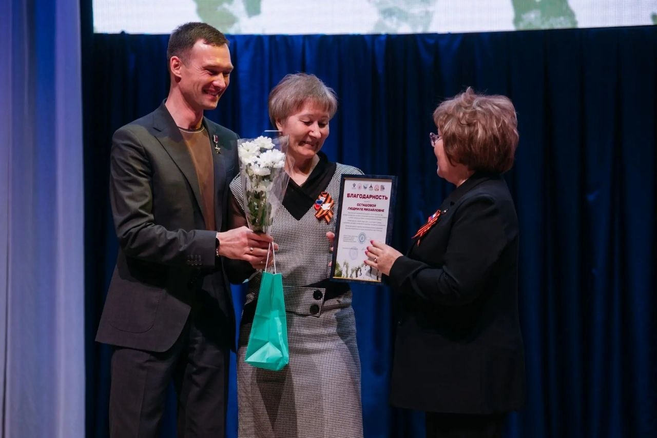 Вечер завершился торжественной частью с патриотической программой, посвящённой Героям России и добровольцам. В фойе концертного зала развернули интерактивную площадку «Фронт и тыл едины». Гости могли увидеть портреты Героев России и волонтёров спецоперации, научиться плести маскировочный костюм «Леший» и «браслет выживания», поучаствовать в благотворительной ярмарке «От сердца к сердцу».